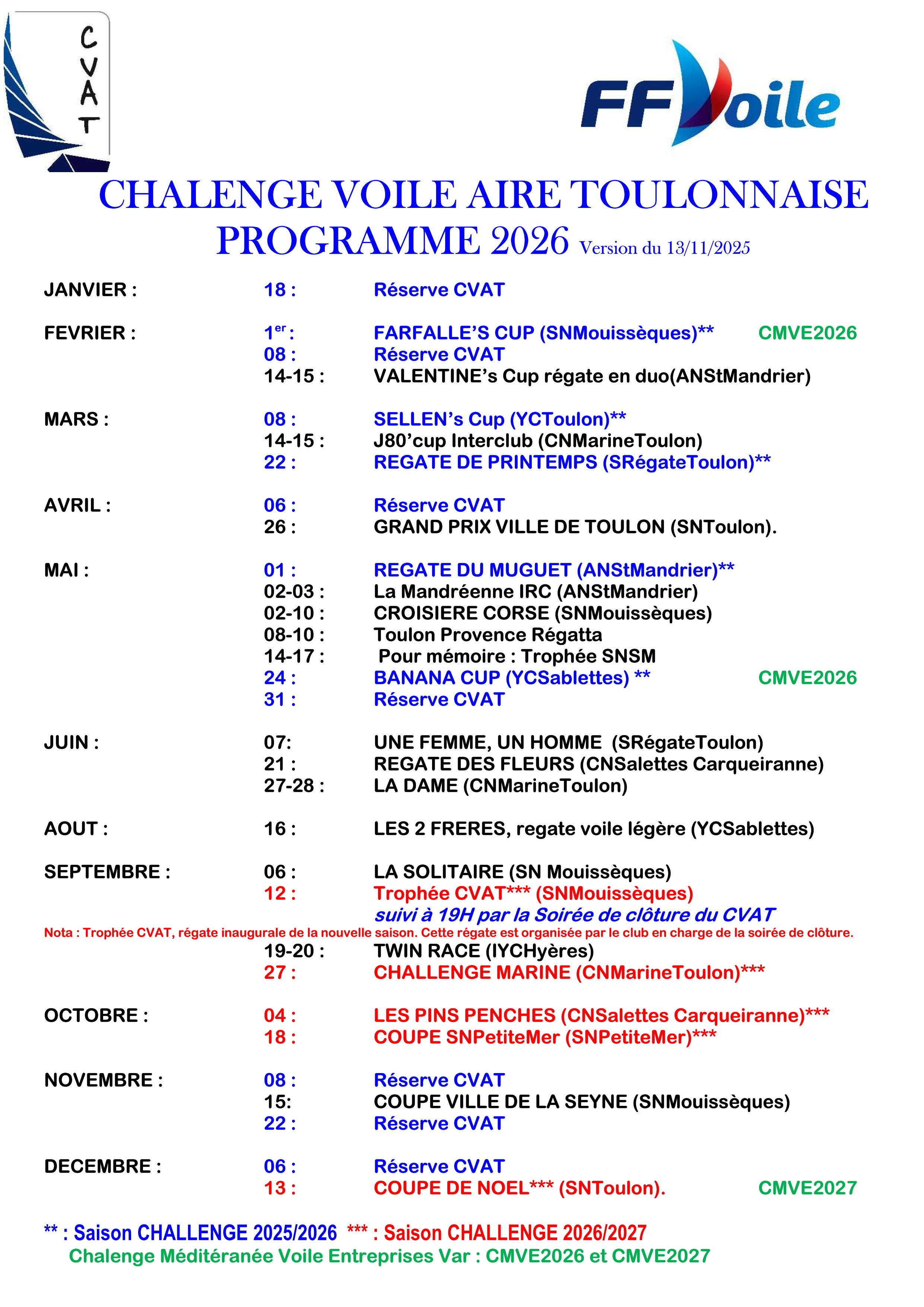 Calendrier des régates 2026